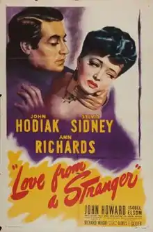 Love from a Stranger is a 1947 American historical film noir directed by Richard Whorf and starring John Hodiak and Sylvia Sidney.[2] The film is also known as A Stranger Walked In in the United Kingdom. It is based on the play of the same title by Frank Vosper, inspired by a short story by Agatha Christie, which had previously been turned into a 1937 British film Love from a Stranger starring Basil Rathbone.