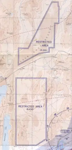 ![]() 1955 map of "U. S. Prohibited, Restricted, Caution and Warning Areas on Elko Sectional Chart": "Black Rock Desert" (R-266) and "Sahwave Mountains" (R-430) | |