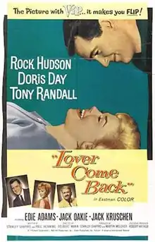 Lover Come Back is a 1961 American Eastmancolor romantic comedy film released by Universal Pictures and directed by Delbert Mann. It stars Doris Day and Rock Hudson and is their second time working together. The supporting cast includes Tony Randall, Edie Adams, Ann B. Davis, and Donna Douglas.