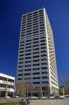 The Lovett Tower is a landmark commercial office, refurbished in 1999 and in 2007,[1] and can be seen towering over the city far away from Canberra. It was formerly known as the MLC Tower but was renamed in 2000 by the Aboriginal and Torres Strait Islander Commission to honour the Lovett family.[9][10]
