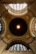 The ceiling of the rotunda measures 105.5 feet (32.2 m) tall and 73 feet (22 m) across.[89] The ceiling is a false dome, made of plaster over steel mesh, and is painted sky blue.[90] The ribs of the false dome are spaced 4 feet (1.2 m) apart at the springing of the arches.[41] A sphere was suspended from the ceiling, reflecting light from eight spotlight beams on the room's third-floor balconies at night.[91] The globe was intended to resemble the moon.[92] The sphere measured 7 feet (2.1 m) across and hung from a steel wire 0.25 inches (6.4 mm) thick, giving the impression of floating in midair.[93] It is not known whether the spotlights were ever used for their intended purpose, but the sphere has since been removed.[94]