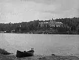 Prior to the development of railroads and the automobile, the Saranac Lakes formed part of an important transportation route in the Adirondacks; one could travel 140 miles (230 km) across, from Old Forge to Lake Champlain, almost entirely on water. In 1849, William F. Martin built one of the first hotels in the Adirondacks— the "Saranac Lake House", known simply as "Martin's"— on the northeast shore of Lower Saranac Lake. Martin's, with room for 80 guests, became a favorite place for hunters, woodsmen, and socialites to meet and interact; a young Theodore Roosevelt was among the guests,[1] and the members of the famous "Philosopher's Camp" on Follensby Pond (including poets Ralph Waldo Emerson and James Russell Lowell and scientist Louis Agassiz) found their guides at Martins.[2] The publication of William H. H. Murray's Adventures in the Wilderness; Or Camp-Life in the Adirondacks in 1869, containing a favorable review of Martin's, started a flood of tourists to the area, leading to a rash of hotel building and the development of stage coach lines. In 1892, Dr. William Seward Webb's Mohawk and Malone Railway reached the village of Saranac Lake; it dramatically reduced travel time from major east coast cities to the Adirondacks, and had a major impact on the hotel and the area. In 1870, the hotel's capacity was doubled. In 1880, Martin lost the hotel through foreclosure. The new owner promptly remodeled and increased capacity to 250 guests. In 1888, it underwent its final renovations, but in 1894, it burned to the ground.