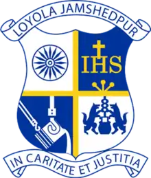The "chakra" or wheel on the left-hand corner is found in the center of India's Tri-colour and stands for progress. The symbol on the right is the logo of the Society of Jesus - which gives the universal trait of the Jesuits - being all things to all people. The symbol in the bottom left corner is a ladle from Tata Steel's blast furnace in Jamshedpur and signifies that the school is located in India's Steel City. The symbol in the right-hand corner of two wolves drinking out of a cauldron is taken from the coat of arms to be found in the Castle of Loyola, Spain, the birthplace of Ignatius of Loyola, the founder of the Jesuit Society. The Latin motto "In Caritat et Justitia" appearing on the ribbon underlining the base of the crest translates to "In charity and justice". The universal motto of the Society of Jesus is "Ad Majorem dei Glorium" meaning "For the greater glory of God".