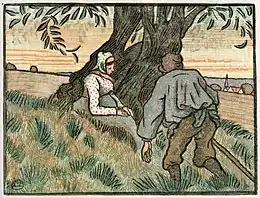 He first visited Britain in 1870–71 during the Franco-Prussian War. He returned in 1883–84, and in 1890 settled permanently in London.[1] On 10 August 1892 he married Esther Levi Bensusan in Richmond.[1] While renting a cottage at Epping, Essex on 8 October 1893 their daughter and only child, Orovida Camille Pissarro, was born. Orovida also became an artist.[1] He met Charles Ricketts and Charles Shannon, and contributed woodcuts to their Dial. In 1894 he founded the Eragny Press[2] and with his wife and illustrated and printed books until the press was closed in 1914. In 1897 the family moved to 62 Bath Road in Stamford Brook, Chiswick.[1] In 1903 he designed the typeface Brook Type.[3]