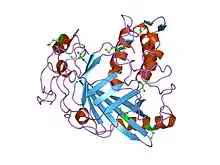 Dinoflagellate luciferase is a multi-domain eukaryote protein, consisting of an N-terminal domain, and three catalytic domains, each of which preceded by a helical bundle domain. The structure of the dinoflagellate luciferase catalytic domain has been solved.[8] The core part of the domain is a 10 stranded beta barrel that is structurally similar to lipocalins and FABP.[8] The N-terminal domain is conserved between dinoflagellate luciferase and luciferin binding proteins (LBPs). It has been suggested that this region may mediate an interaction between LBP and luciferase or their association with the vacuolar membrane.[9] The helical bundle domain has a three helix bundle structure that holds four important histidines that are thought to play a role in the pH regulation of the enzyme.[8] There is a large pocket in the β-barrel of the dinoflagellate luciferase at pH 8 to accommodate the tetrapyrrole substrate but there is no opening to allow the substrate to enter. Therefore, a significant conformational change must occur to provide access and space for a ligand in the active site and the source for this change is through the four N-terminal histidine residues.[8] At pH 8, it can be seen that the unprotonated histidine residues are involved in a network of hydrogen bonds at the interface of the helices in the bundle that block substrate access to the active site and disruption of this interaction by protonation (at pH 6.3) or by replacement of the histidine residues by alanine causes a large molecular motion of the bundle, separating the helices by 11Å and opening the catalytic site.[8] Logically, the histidine residues cannot be replaced by alanine in nature but this experimental replacement further confirms that the larger histidine residues block the active site. Additionally, three Gly-Gly sequences, one in the N-terminal helix and two in the helix-loop-helix motif, could serve as hinges about which the chains rotate in order to further open the pathway to the catalytic site and enlarge the active site.[8]