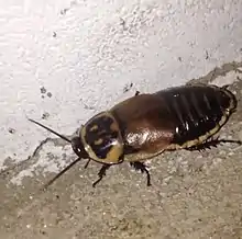 L. verrucosa grows to a length of about 4 cm (1.6 in) and is mainly black or dark brown with a white margin to the dorsal sclerites. It is sexually dimorphic, with males being slightly smaller than females and having a pair of large, usually yellow spots on the pronotum.[2] These are covered by a thin translucent cuticle and have traditionally been thought to be luminescent organs.[3] However researchers noticed that when in captivity these cockroaches were fed on carrots, the colour of the spots deepened to orange or even red. On closer examination the surface of the cuticle bears a number of small knobs each bearing a small mechanoreceptor. The upper surface of the spots is partially obscured by a pad of enlarged fat body cells which accumulate carotenoids on a diet of carrots. Insects are unable to synthesize carotenoids and the presence of orange or red spots may indicate a well-fed, fit individual. The researchers found no evidence of light emission but hypothesized that the pigmented spots may play a part in male aggression or mate choice by the female, or may provide warning signals.[4]