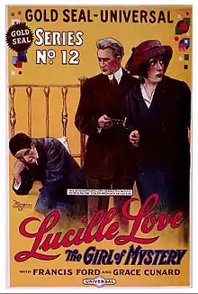 Lucille Love, Girl of Mystery is a 1914 American action film serial directed by Francis Ford. It was the first serial by Universal. It was originally intended to be a short subject. The serial is now considered to be lost with only four episodes surviving.[2] Prints and/or fragments were found in the Dawson Film Find in 1978.[3]