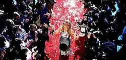 American singer-songwriter Taylor Swift performed the song on her Speak Now World Tour on September 20, 2011, located in Louisiana, as a tribute to Spears.[34][35] Wearing her signature lilac dress, Swift started to play the first chords of "Lucky" on her guitar, while singing, "Early morning/She wakes up/With a knock, knock, knock on the the [sic] door/It's time for makeup/Perfect smile/It's you they're all waiting for."[36] Scott Shetler of Pop Crush explained that "the crowd energy for the Britney cover didn't seem as high as when Swift covered Eminem in Detroit or Justin Bieber in Toronto."[37] Jenna Hally Rubenstein of MTV, however, praised the performance, and noted that the show's crowd gave a positive reaction to the cover, saying, "though the video is sideways and features the amateur videographer's own personal sing-along, the excitement in her voice is a testament to Taylor's song choice. Or in other words, we can almost guarantee that every normal, living, breathing Louisiana-bred girl in attendance at Taylor's show is also obsessed with Britney Spears."[36] Becky Bain of Idolator explained that she had no doubts that Swift would cover a Spears song, but was surprised that the song Swift chose was "Lucky".[38] PopDust writer Katherine St Asaph explained that "Lucky" is "one of the few Britney lyrics that could just as easily be written for/by Taylor and one of the few songs that wouldn’t need massive re-arranging."[34]