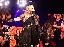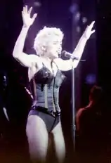"Lucky Star" was included in four of Madonna's concert tours: Virgin (1985), Who's That Girl (1987), Confessions (2006) and Rebel Heart (2015–2016). On The Virgin Tour, Madonna performed the song wearing a black ensamble consisting of a crop top beneath a vest with a silver cross pattée, matching fringed elbow length gloves and miniskirt, leggings, low heel leather boots and a crucifix earring in one ear.[63] The performance of the song at Detroit's Cobo Arena was included on the Madonna Live: The Virgin Tour video release (1985).[64] Two years later, it was sung as the second number of the Who's That Girl World Tour; the performance found the artist singing underneath a disco ball hung from above the stage.[65] She was decked out in the same black bustier from her "Open Your Heart" (1987) video, and her hair was platinum blonde and done in a big bushy style.[65] From the Chicago Tribune, Scott A. Zamost and Elizabeth Snead felt that, although Madonna's vocals sounded strong, she was "drowned out frequently and annoyingly by an overpowering back-up band" in numbers such as "Lucky Star".[66] Two different performances from the tour can be found on the releases Ciao Italia: Live from Italy, filmed at Stadio Communale in Turin, Italy on September 4, and Who's That Girl: Live in Japan, filmed at Korakuen Stadium in Tokyo, Japan on June 22.[67][68]