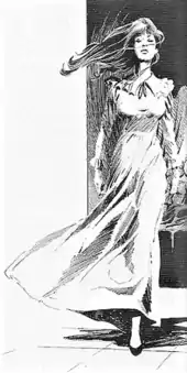 Lucy Westenra is a 19-year old woman, "blonde, demure, and waiting for the right man to come along to marry her".[1] She is, however, not a passive woman, and clearly expresses her sexual desires: she has three suitors, and writes to her friend Mina that she would like to marry all of them.[1] All three propose to her on the same day—Arthur Holmwood, the wealthy son of Lord Godalming; Quincey Morris, an American adventurer; and Dr. John Seward, a psychiatrist—and she chooses Holmwood. She is prone to sleepwalking and is attacked by Dracula, who gradually drains her of her blood until it eventually proves fatal. In her final moments, her vampiric side emerges and nearly tries to bite Arthur, but Lucy regains her human senses and before dying asks Abraham Van Helsing to protect Holmwood, which he does.[2]