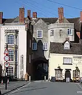 The first recorded royal permission to maintain defensive town walls was given to the "men of Ludlow" in the Patent Rolls of 1233. The entry is however incomplete and atypical and was not renewed in the usual way. A murage grant was next made in 1260 and renewed regularly over the next two centuries. This time the grant was made by name to Geoffrey de Genevile, Lord of Ludlow. From this and other surviving documents it seems that the town walls and gates were in place by 1270.[27] They were constructed about the central part of the community with four main gates and three postern gates. Because the walls were constructed after the development of the town's streets, the positions and names of the four main gates are based on the streets they crossed; the postern gates on the other hand are located by and named after old outlying districts. The 7 gates are (clockwise from the castle; postern gates in italics) Linney, Corve, Galdeford, Old, Broad, Mill and Dinham. An eighth unnamed 'portal' gate (smaller than a postern gate) existed in the wall just to the northwest of the castle, now in the gardens of Castle Walk House.[28] The town walls are largely still in existence, although a section alongside the churchyard of St Lawrence's is, as of 2015, in need of repairs.[29]