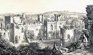 The town of Ludlow was increasingly fashionable and frequented by tourists, with the castle forming a particularly popular attraction.[116] Thomas Warton published an edition of Milton's poems in 1785, describing Ludlow Castle and popularising the links to Comus, reinforcing the castle's reputation as a picturesque and sublime location.[117] The castle became a topic for painters interested in these themes: J. M. W. Turner, Francis Towne, Thomas Hearne, Julius Ibbetson, Peter de Wint and William Marlowe all produced depictions of the castle during the late 18th and early 19th centuries, usually taking some artistic licence with the details in order to produce atmospheric works.[118]