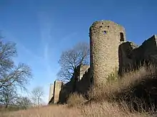 The western curtain wall is approximately 6-foot-5-inch (1.96 m) thick, and guarded by the 13th-century Mortimer's Tower, 18 feet (5.5 m) across externally, with a ground floor vaulted chamber inside, 12-foot-9.5-inch (3.899 m) large.[163] When first built, Mortimer's Tower was a three-storey gateway with an unusual D-shaped design, possibly similar to those at Trim Castle in Ireland, but in the 15th century the entrance way was blocked up to turn it into a conventional mural tower, and in the 16th century an additional internal floor was inserted.[164] The tower is now roofless, although it was roofed as late as the end of the 19th century.[165]