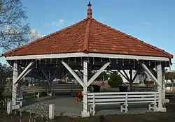 Ludowici Well Pavilion is a historic site in Ludowici, Georgia, located on McQueen Street. It was constructed in 1907 and supplied drinking water.[3] It is in an open public area in the center of town. It is shaped like an octagon and has wooden benches inside, which were originally outside. It uses locally made tiles on the roof. With renovations in 1958 and 1983, surrounding pine trees were removed, as well as a paneled ceiling and brick floor. A steel post was added to the center for support.