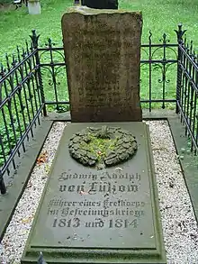 The valor of the Black Troop is commemorated in Theodor Körner's poem Lützows wilde, verwegene Jagd ("Lützow's wild, daring hunt").[4] As Lützow's adjutant, he met his death at the Battle of Gadebusch.[1] Among other notable members of the corps were Friedrich Fröbel and Friedrich Ludwig Jahn. This incident was portrayed in the 1927 film Lützow's Wild Hunt directed by Richard Oswald.