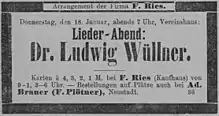 Wüllner was particularly known as a Lieder singer, collaborating with some of the most important musicians and composers of their time, such as Johannes Brahms, Richard Strauss, Fritz Steinbach, Arthur Nikisch, Hermann Zilcher, Artur Schnabel and Felix Weingartner.[2][3] Wüllner was often called the "Kammersänger of the German people", admired for the clarity of his diction and the expressive dramatic presentation.[2] Max Reger dedicated one of his six songs, Sechs Lieder, Op. 35, to him in 1899.[4]