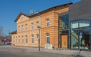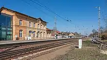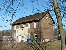 The listed station building, which is located on the western side of the railway tracks, dates from 1886. It is a two-story building of yellow brick with a pitched roof.[7] It was developed on an axis to the south. The building is no longer used for railway purposes. It was renovated and now houses the town museum and Ludwigsfelde technical centre. After 2010 it was supplemented by an annex on its south side.
