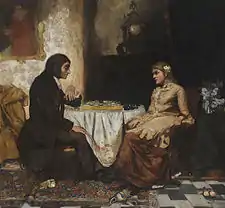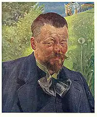 After two years, he decided to devote himself entirely to art. Izydor Jabłoński, Władysław Łuszczkiewicz, Florian Cynk, Leopold Löffler and Jan Matejko were among his teachers. During this time, he received several awards from the Kraków Society of Friends of Fine Arts. In 1886, he continued his studies in Vienna under August Eisenmenger and was later in Munich,[1] where he studied with Alexander von Wagner and Alexander von Liezen-Mayer.