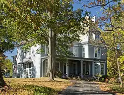 The Luethstrom–Hurin House is a weatherboarded structure with a stone foundation and slate roof.[1] When constructed in 1865, the house was a simple Italianate building with a five-bay facade. It only retained this form for a few years; by 1875, it had been expanded to the rear, and 1885 modifications introduced a Second Empire elements such as the tower and dormer-pierced roof.[2] The tower protrudes from one side of the two-story facade (on the right as one views the house from a distance), while a bay window protrudes farther from the tower, and a single-story porch shelters the entrance and the remaining parts of the facade. Bracketing supports the overhanging cornice above the second-story windows.[3]