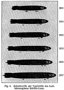 Schütte-Lanz (SL) is the name of a series of rigid airships designed and built by the Luftschiffbau Schütte-Lanz company from 1909 until 1917.[1] One research and four passenger airships were planned for post-war use, but were never built. The Schütte-Lanz company was an early competitor of the more famous airships built by Ferdinand von Zeppelin.[2] It is common for all rigid airships to be informally called zeppelins regardless of their manufacturer, and Schütte-Lanz airships are often referred to as such, but this name technically only applies to those manufactured by the Zeppelin company.