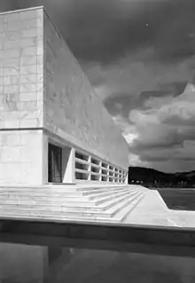 The next year, after ending the university career, with Giulio Pediconi, Mario Paniconi e Mario Tufaroli, attended at the fifth Triennale di Milano with a project for a country house designed for a scholar.[5] In this year he also met Renato Ricci, at that time president of the Opera Nazionale Balilla (ONB), that, the following year, appointed Moretti ONB technical director, succeeding to Enrico Del Debbio.[4] In this role Moretti designed some of the youth centres of ONB and Gioventù Italiana del Littorio: in 1933 in Piacenza[6] and in Rome, Trastevere,[7] in 1934 in Trecate,[8] in 1935 a women's centre in Piacenza and in 1937 another youth centre in Urbino.[9] His work was also part of the architecture event in the art competition at the 1936 Summer Olympics.[10]