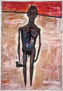 By the 1980s his cramped compositions shift to a centralized, nude figure (often self-portrait) that dominates the composition. The mood and color are somber and the figure is often distorted.