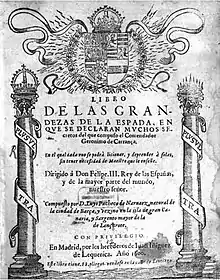 "A simple way of examining teachers in the art of fencing with weapons" is another of the most famous works written by Don Pacheco de Narvaez (Dialogue between a pupil and an exam teacher on philosophy and art of fencing).[30][31]