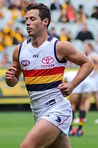 Brown established himself in Adelaide's team as a negating small defender in 2013, filling the role vacated by retired veteran Michael Doughty and playing 21 of a possible 22 games.[3] He signed a two-year deal with the club early in the year,[4] and was nominated for the 2013 AFL Rising Star award in the final round of the season.[5] Brown continued to play this role to great effect in 2014 and 2015, playing every game in both seasons, keeping the opposition's best small forward to a goal a game or less, and developing his attacking game with a disposal efficiency of 80.2% in 2015.[3] During the year, Brown signed another two-year contract with Adelaide.[6]