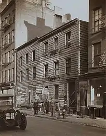 - Sixteen Cornelia Street was one of two small wood frame houses sitting side by side on a block near the intersection of 6th Avenue and West 4th Street that consisted mainly of larger brick apartment buildings and commercial establishments.[29][30] Both buildings had three stories above street level and basements below. Photographs taken in 1900 and 1933 show them to have been little changed in that period.[31] In 1920 the building at 16 Cornelia held six tenants, four single occupants along with Upshure and his mother.[21] All but one were African Americans. (The exception was a woman named Jane Davis, born in England to English parents, who was married to a man named Orlando Davis.) The other occupants included an widowed man of 65 who had no job; a man of 52, married but living apart from his wife, working as a stable man; Jane Davis 31, having no job, and Orlando Davis, 33, a house painter.[21]