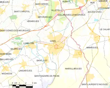 Lunel is located 21 km (13 mi) east of Montpellier and 28 km (17 mi) southwest of Nîmes (Gard).