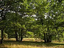 The greater part (about 58%) of the Lüneburg Heath Nature Reserve consists of woods, primarily pine forests, which were planted in the second half of the 19th century on former heathland and drifting sand. In some cases the dunes simply became naturally overgrown, again with pines. There are only a very few old stands of sessile oaks, which stem from the logging industry during the time of the Kingdom of Hanover. In many parts of the nature reserve there are so-called Stühbüsche (a form of coppice), trees that were coppiced by repeatedly being cut short. In the meantime they have grown wild again and have a characteristic and unusual appearance with their multiple trunks. Near Wilsede there is the remnant of a Hutewald, a wood pasture with giant, multi-stemmed beech trees.[7]