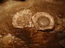 Streams and true springs are absent, but there are hundreds of basins, varying from 1 to 50 feet (0.30 to 15.24 m) in diameter, and from 6 inches (150 mm) to 15 feet (4.6 m) in depth. The water in them contains carbonate of lime, which often forms concretions, called pearls, eggs, and snowballs, according to their size. On the fracture these spherical growths are found to be radiated in structure.[5]