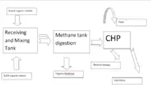 The Lusaker Biogas Plant generates heat and electricity from biogas produced from poultry manure of the Lusakert Pedigree Poultry Plant. For production of biogas, the liquid manure is processed in an anaerobic digesters of 2,200 cubic metres (78,000 cu ft) at temperature of 38 °C (100 °F).[3] There is an option to build the second digester. The LBP was considered to produce 5,280 cubic metres per day (186,000 cu ft/d) of biogas with a methane (CH4) content of 70%. Remains of manure are used for production of 75,000 tonnes of organic fertilizer per year. After removing sulfuric acid from gas, it is used for heat and power generation.[4] The LBP has installed electric capacity of 0.85 MW and it is able to generate 7 GWh of electricity annually.[1] The average capacity that Lusakert Biogas Plant runs with is 50-60%. The electricity produced at LBP is sold at 40 drams (about 7.5 cents) per kilowatt. In 2014, the plant did not generate electricity due to economic difficulties of the poultry plant which resulted in low amounts of wastes.[1]