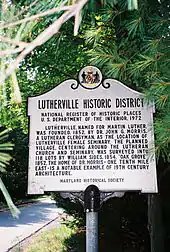 The Lutherville Historic District was added to the National Register of Historic Places in 1972.[9][10] Notable structures, in addition to the old college building and the many Victorian homes, include: