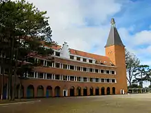 The building stands on a plateau. From one side it overlooks the great lake of Dalat, and from the other side looks over the valley where the railway station was built.[1] The French architect Paul Moncet designed the building and supervised its construction. The building was constructed of red bricks imported from Europe. The roof was also made from material imported from France, but has since been restored. The main building is three stories high, with 24 rooms, with a 54 metres (177 ft) bell tower.[2] The building describes an arc. There are traces of a large clock on the exterior of the bell tower. It has been recognized by the World Association of Architects as one of the 1,000 original buildings of the 20th century.[3]