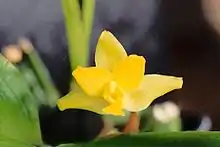 Lycaste cruenta has greenish yellow flowers with bright orange petals and labellum about 8 cm (3 in) wide. They appear in spring in the flower stems up to 15 cm (6 in) high, and there can be more than 20 flowers in one plant. They have a sweet scent resembling cinnamon in the evening. The leaves grow to 38 cm (15 in) long and 15 cm (6 in) wide and are shed before flowering. Lycaste cruenta has pseudobulbs up to 10 cm (4 in) long and 5 cm (2 in) wide.[1]