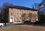 Carrier Hall was one of several buildings which students plundered for riot material in 1962. Branching off from the two-story main section is a rear section connected by two covered passageways. This section also contains two stories and is slightly inset and setback from the main section.[2]
