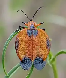 Lycus trabeatus, common name tailed net-winged beetle, is a species of beetle in the Lycidae family, which is native to the eastern, southern Afrotropics and Arabian Peninsula. They are diurnal, aposematic insects. Adults feed on various flowers and their nectar, while larvae live under tree bark, in dead wood, or in detritus where they may live on fungi.[2]