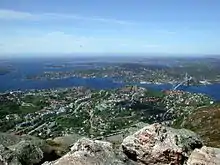 Lyderhorn is a mountain in the city of Bergen in Vestland county, Norway. It is one of "De syv fjell", the seven mountains surrounding the city centre, and the starting location of Bergen Turlag's annual trip of the mountains. It is located by Liavatnet approximately 5 kilometres (3.1 mi) west of the city center. Due to its prominent visibility from the seas, it has historically been a navigational mark for sailors.[3] The 329-metre (1,079 ft) tall Ørnafjellet is an adjacent peak, and below Ørnafjellet are the two lakes Skåleviksvatnet and Søre Skåleviksvatnet. North of Ørnafjellet is Kvarven fort, a strategic point during World War II, still featuring several bunkers and cannon positions used in the defense of Bergen. Lyderhorn, Ørnafjellet and Kvarven are popular hiking areas.[3]