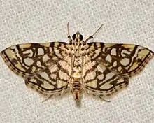 This wingspan is about 17 mm. The forewing ground colour is pale yellowish or cream with several irregular white patches, surrounded and connected by thick brown lines. The white patch nearest the anal angle is oval or circular and there is a broad white subterminal line which becomes wider near the costa. The distal edge of this line curves down toward the apex just before reaching the costa. The forewing colour and pattern is repeated on the hindwings. Adults are on wing from April to October.[2]
