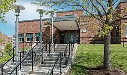 The building is a quonset shaped structure covered with multi-colored (orange, tan, black, and brown) brick wall cladding set in a common bond pattern. Projecting from the facade of the structure is a one-story rectangular wing flanked on either side by two vertical appendages, which have multi-paned colored glass windows. The one story wing has a strip of casement windows. The stairway is situated on the west side of the building. A white concrete block structure with wall buttresses connects Lynah Rink to Bartels Hall.[2] It was constructed for $500,000 with a donation from Walter S. Carpenter, Jr. whose gift came with the stipulation that he did not want his name on the building. The facility was designed by Van Storch, Evans, and Burkavage of Waverly, PA and constructed by Streeter Associates of Elmira, NY.[3]