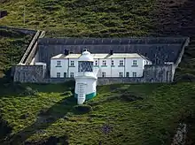 In 1906, the lighthouse was provided with an explosive fog signal,[8] which sounded once every five minutes and was actuated by an automatic clockwork firing mechanism.[9] This was housed in a hut at the top of the steep steps leading down to the lighthouse, (the hut has since been demolished, along with the adjacent explosives magazine).[2] The explosive signal remained in use until 1958[9] (a few years later the mechanism was offered 'on permanent loan to any British museum which may be interested').[10] In its place, a triple-frequency electric fog signal was installed, sounding through a stack of thirty Tannoy speakers built on to the front of the lighthouse tower; because the lighthouse was not yet connected to mains electricity the 3,000 rpm alternator (which simultaneously generated alternating current of the three different frequencies required) was driven by a diesel engine.[9] The fog signal has since been decommissioned.