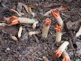 Lysurus cruciatus or the lizard's-claw stinkhorn[4] is a species of fungus in the stinkhorn family. It was first described scientifically in 1845 by French botanists François Mathias René Leprieur and Camille Montagne as Aserophallus cruciatus. German mycologist Paul Christoph Hennings transferred it to the genus Lysurus in 1902.[1] Its fruit bodies feature a white, cylindrical tube supporting a cluster of hollow, reddish pointed arms whose surface is covered with foul-smelling spore mass, or gleba. The gleba is brownish to greenish in color, and contains spores with dimensions of 3–4 by 1.5–2 µm.[5]