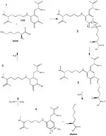 LTQ is crucial in LOX-catalyzed conversion of lysine residues to α-aminoadipidic-δ-semialdehydes, generally referred to as allysines.[12] In the oxidation of lysine, the ε-amine is first converted to a Schiff base via reaction with LTQ. While LTQ is still bound to the substrate, rate-limiting removal of the ε-proton yields an imine intermediate. Subsequent hydrolysis of the imine leads to release of the aldehyde product, allysine. Molecular oxygen and the copper ion are utilized to reoxidize the cofactor and yield another imine, producing hydrogen peroxide as a side product. Additional hydrolysis releases ammonia and the original cofactor, completing the catalytic cycle.[13]