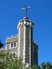 The station, which was designed by local architect Thomas Cane, was completed in 1876.[2] The castle-like complex initially comprised an octagonal tower supporting the time ball and a three-storey building which provided accommodation, work areas as well as housing the clock.[2] The materials used were local scoria and contrasting lighter coloured Oamaru stone.[2] Additions were made to the building between 1877 and 1878 and again in 1912. The astronomical clock originated from Britain and the time ball was supplied by Siemens Brothers of Germany.