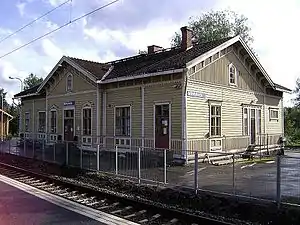 The Mäntyharju railway station (Finnish: Mäntyharjun rautatieasema, Swedish: Mäntyharju järnvägsstation) is located in the municipality and central urban area of Mäntyharju, Finland. It is located along the Kouvola–Iisalmi railway,[2] and its neighboring stations are Kouvola in the south and Mikkeli in the north.[4]