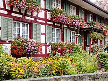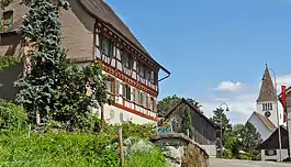 The Church of St. Jakob was first mentioned in 1155 as chapel under the administration of the Cathedral of Constance. The combined bell tower and choir was probably built in the 13th or 14th century. In 1465 the nave was extended toward the west and the tower was raised. The sacristy was added in 1489, bringing the church to its current appearance. In the same year it was raised to a parish church and the center of a local parish. The baptismal font was added in 1590. The pulpit was built in 1790. The sundial was painted in 1808 by Conrad Boltshauser and restored in 1954.[17] During a renovation in 1975, two frescos were discovered. The Weihnachtsgeschichte or Christmas Story was painted in the 15th century, while the Last Judgement is from around 1460–70. The church is shared between the Reformed and Roman Catholic residents, with Reformed services at 9:30 and Catholic Mass at 11:15. For Catholics the church is a chapel under the parish of Weinfelden.[18]