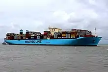 Mærsk Mc-Kinney Møller (Danish: [ˈmɛɐ̯sk məˈkʰini ˈmølɐ]) is the lead ship of Maersk Line's Triple E class of container vessels. At the time of its entry into service in 2013, it had the largest cargo capacity in twenty-foot equivalent unit (TEU) of any vessel, and was the longest container ship in service worldwide.[3][10] Constructed for Maersk by Daewoo Shipbuilding & Marine Engineering (DSME) of South Korea, it was launched in February 2013 and entered operational service in July 2013. It was named for Mærsk Mc-Kinney Møller, the CEO of Maersk from 1965 to 1993.[11] The ship is the first of a class of 20 identical vessels.[4]