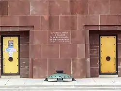 The monument consists of a wall of pink sandstone from the Vosges 150 metres (490 ft) long, on which are mounted sixteen bronze hauts-reliefs depicting, in allegorical form, different types of heroic combat. A Cross of Lorraine 12 metres (39 ft) high stands in the center, in front of which the permanent flame of the resistance burns on a bronze structure.[2] The cross is essentially a Gaullist symbol.[7] There are two bronze doors under the cross. One leads to the burial crypt, carved into the rock. The other gives access to the stairway that leads to the remembrance path.[2] At the base of the Cross of Lorraine an inscription gives part of de Gaulle's speech of 18 June 1940: "Quoiqu'il arrive la flamme de la résistance ne s'éteindre pas" ("Whatever happens, the flame of the resistance will not be extinguished.")