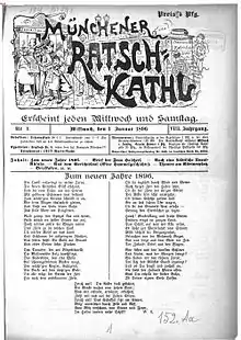 Die Münchener Ratsch-Kathl, later Münchener Stadtanzeiger (not to be confused with the Münchner Stadtanzeiger), was a weekly newspaper published in Munich from 1889 to 1921. It referred to itself as an Unterhaltungsblatt für gemüthlichen Verkehr ("entertainment paper for genial circulation"). The nickname "Ratschkathl" ("rattlepuss") was an established synonym for a "chatty and gossip addicted woman" in the Bavarian dialect at that time. The newspaper compared itself with the Ratschkathl on the front page of its initial edition of May 11, 1889.